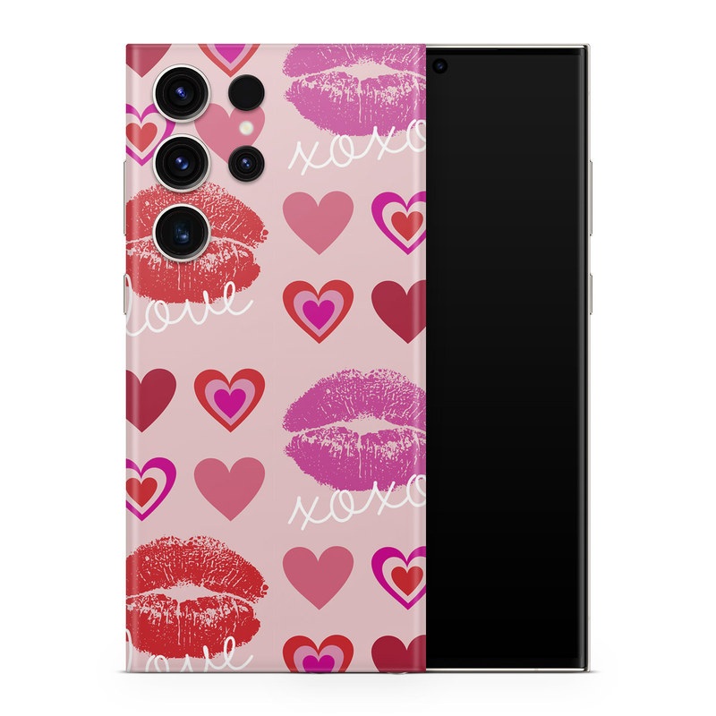 iStyles Samsung Galaxy S23 Series Skin design of Organ, Pink, Red, Font, Material property, Magenta, Heart, Pattern, Happy, Love, with pink, red, white colors, and tagged with patterns, hearts, signs, lips, lipstick, xoxo, love.