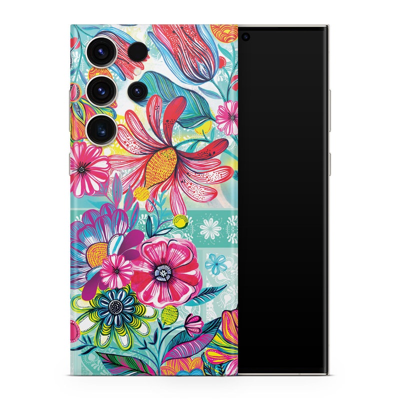 iStyles Samsung Galaxy S23 Series Skin design of Pattern, Floral design, Textile, Pink, Design, Flower, Visual arts, Wildflower, Plant, with blue, pink, purple, red, green, yellow, orange colors, and tagged with patterns, flowers, bright, carpintos, colorful, flowers, spring, summer, teal.