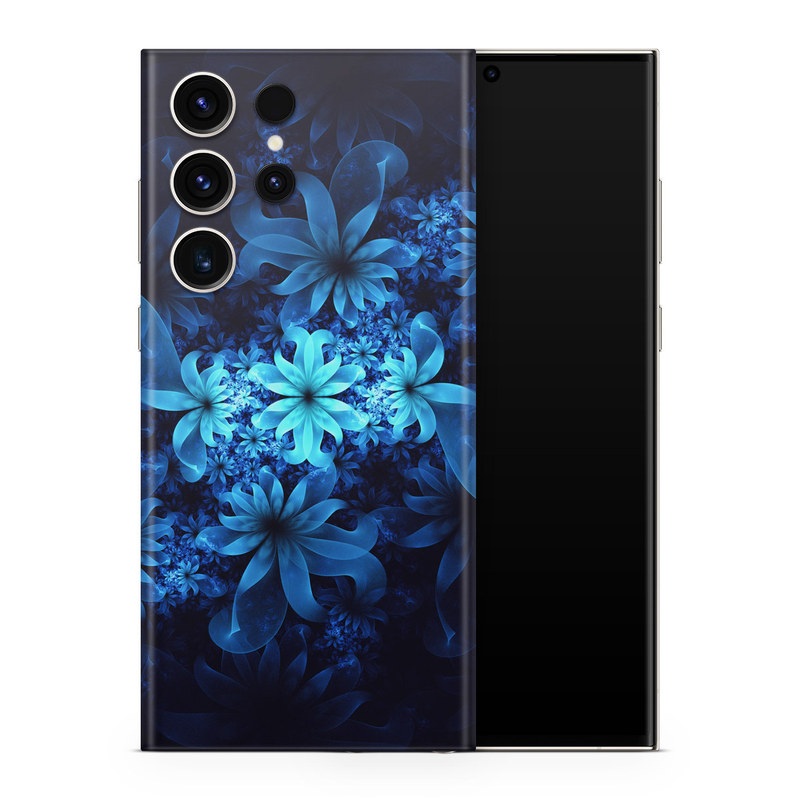 iStyles Samsung Galaxy S23 Series Skin design of Nature, Blue, Petal, Organism, Darkness, Flower, Colorfulness, Electric Blue, Majorelle Blue, Pattern, Botany, Still Life Photography, Space, Aquatic Plant, Fractal Art, Visual Arts, Illustration, Symmetry, Midnight, Wildflower, Painting, Still Life, with black, blue, white colors, and tagged with flowers, patterns, blue, fantasy, flower, flowers, garden, glow, light.