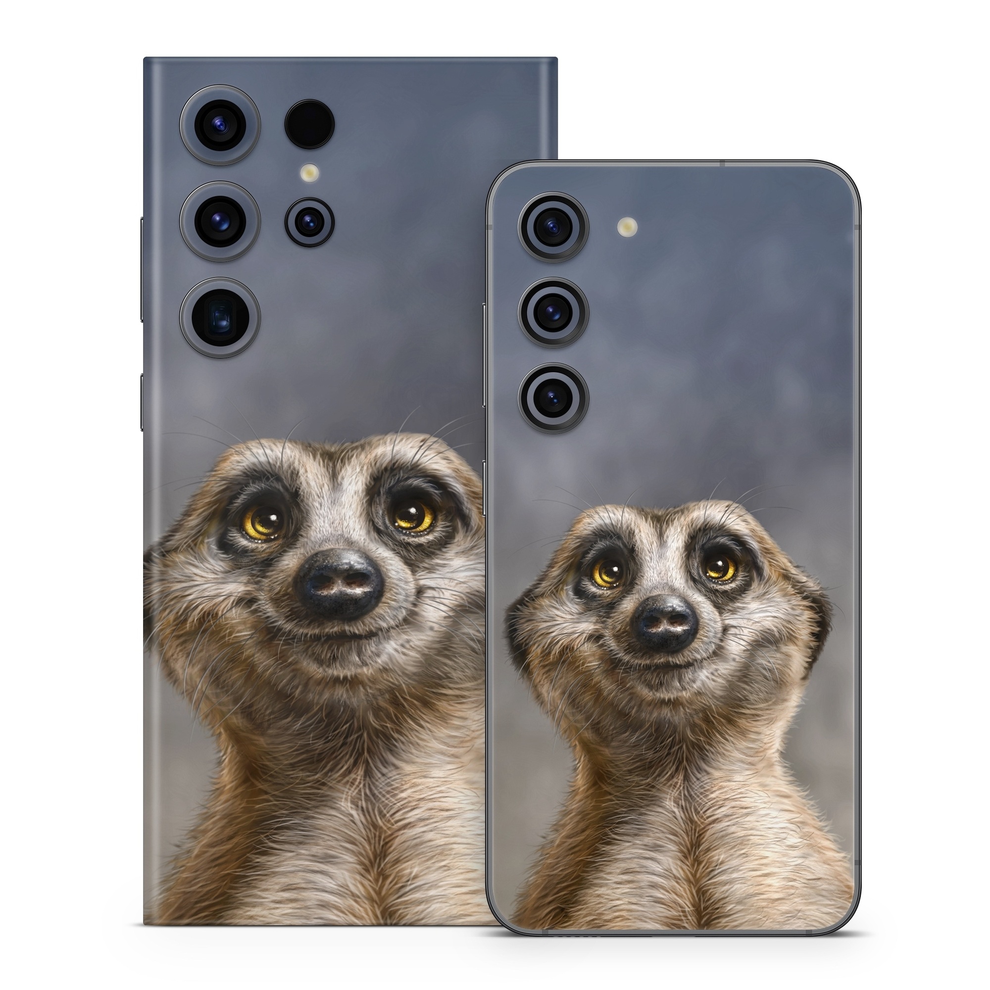 iStyles Samsung Galaxy S23 Series Skin design of Face, Head, Eye, Eyelash, Human body, Carnivore, Iris, Terrestrial animal, Whiskers, Snout, with white, gray, brown, yellow, black, blue colors, and tagged with animals, fineart, mongoose, smiling.