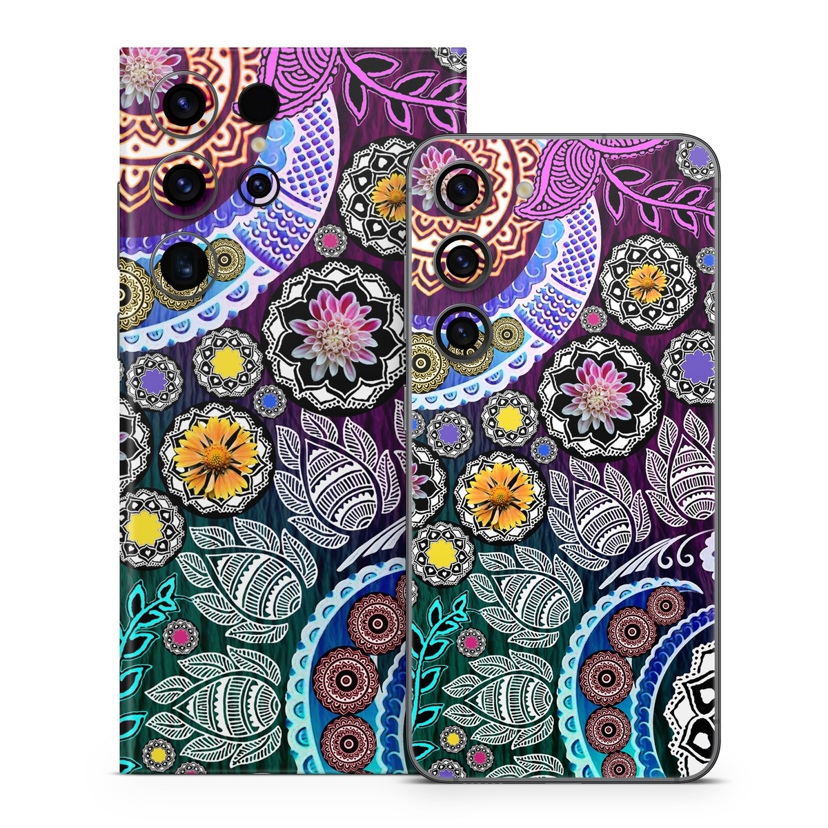 iStyles Samsung Galaxy S23 Series Skin design of Pattern, Psychedelic art, Art, Visual arts, Design, Floral design, Textile, Motif, Circle, Illustration, with black, gray, purple, blue, green, red colors, and tagged with patterns, flowers.
