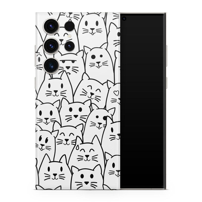 iStyles Samsung Galaxy S23 Series Skin design of White, Line art, Text, Black, Pattern, Black-and-white, Line, Design, Font, Organism, with white, black colors, and tagged with patterns, animals, animals, cartoon, cats, cute, kitty, lineart, sketch.