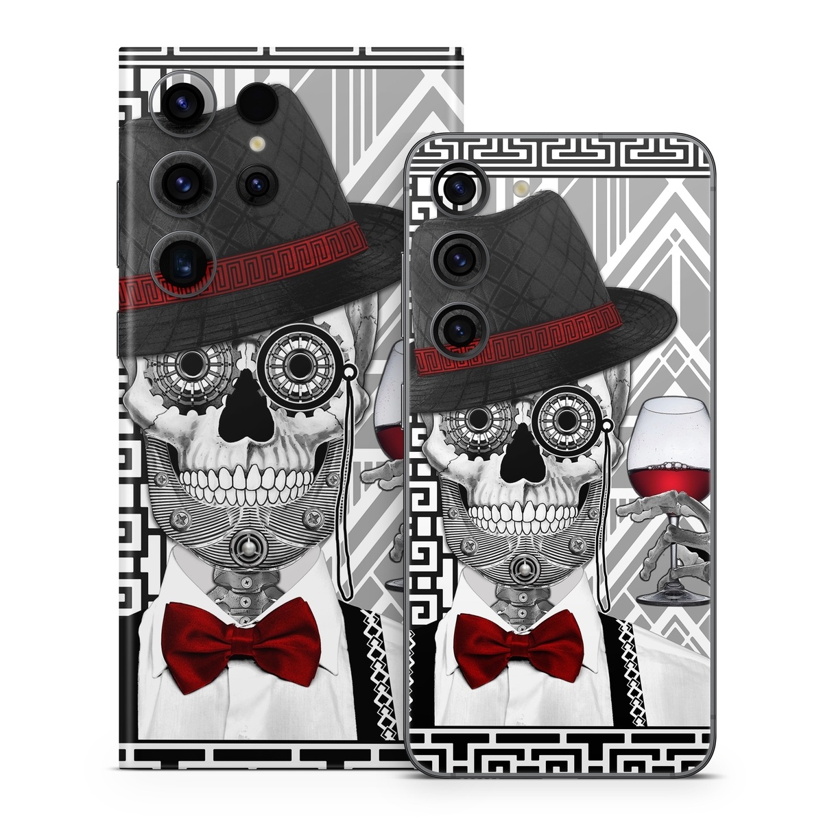 iStyles Samsung Galaxy S23 Series Skin design of Cartoon, Poster, Font, Illustration, Headgear, Games, Photo caption, Fictional character, Graphic design, Hat, with black, white, red colors, and tagged with skulls, objects, patterns, 1920's, artdeco, blackandwhite, calavera, dayofthedead, diadelosmuertos, flapper, greatgatsby, newmexico, pattern, skeleton, skull, sugarskull, vanderbone, wine.