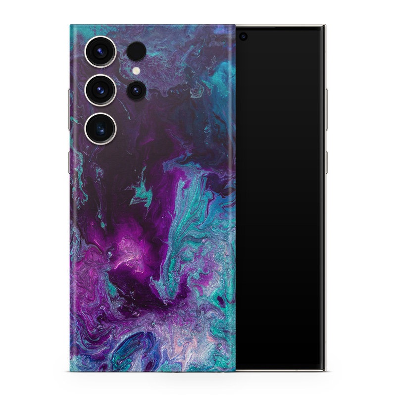 iStyles Samsung Galaxy S23 Series Skin design of Blue, Purple, Violet, Water, Turquoise, Aqua, Pink, Magenta, Teal, Electric blue, with blue, purple, black colors, and tagged with abstract, space, galaxy, marbles, milkyway, nebula, space.