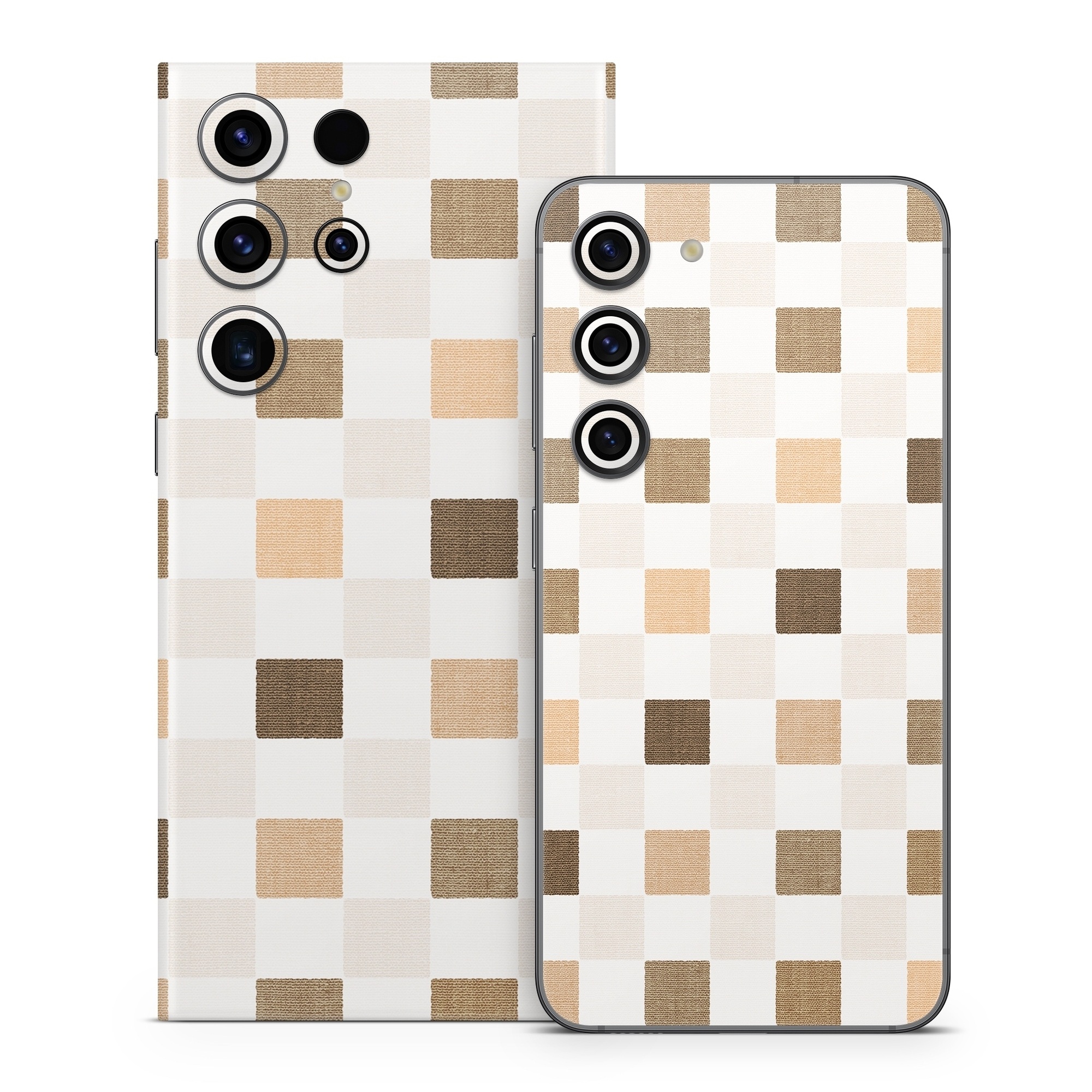 iStyles Samsung Galaxy S23 Series Skin design of Brown, Rectangle, Beige, Textile, Sleeve, Grey, Khaki, Material property, Symmetry, Art, with white, gray, brown colors, and tagged with patterns, checkered, squares, brown, carpet.