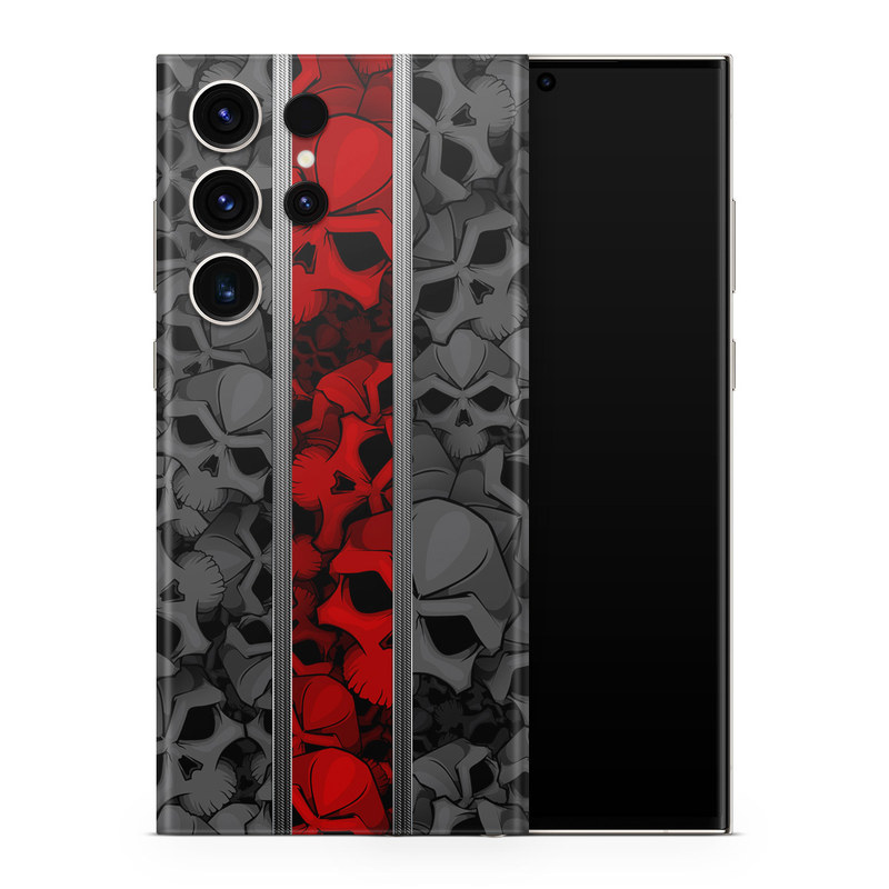 iStyles Samsung Galaxy S23 Series Skin design of Font, Text, Pattern, Design, Graphic design, Black-and-white, Monochrome, Graphics, Illustration, Art, with black, red, gray colors, and tagged with skulls, patterns.