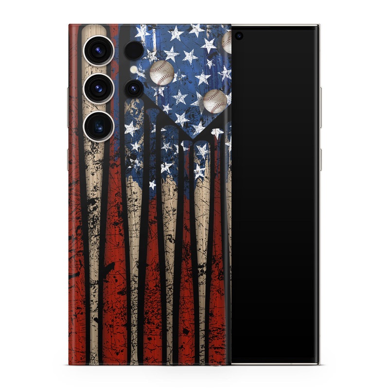 iStyles Samsung Galaxy S23 Series Skin design of Baseball bat, Baseball equipment, with black, red, gray, green, blue colors, and tagged with patterns, signs, flags.