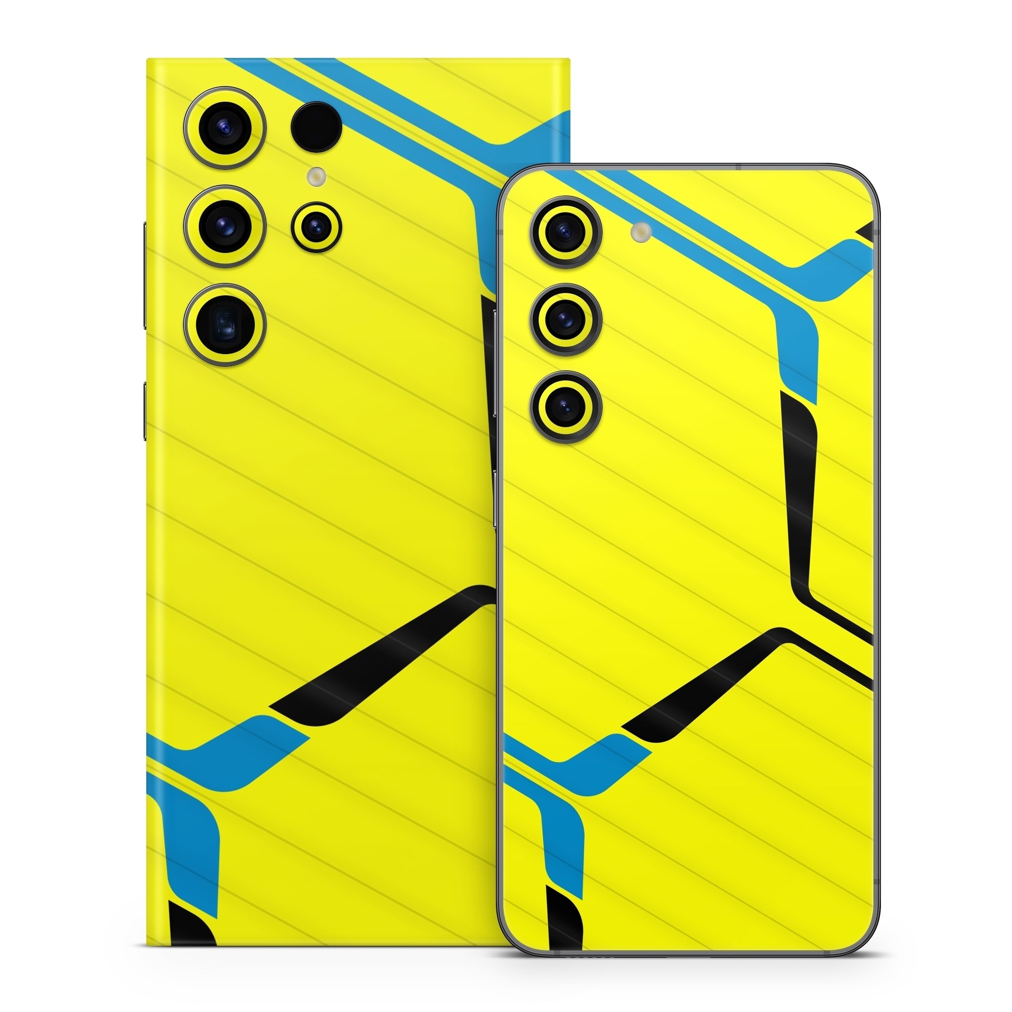 iStyles Samsung Galaxy S23 Series Skin design of Azure, Triangle, Font, Parallel, Symmetry, Pattern, Electric blue, Symbol, Rectangle, Design, with yellow, blue colors, and tagged with patterns, hexagon, pattern, lines.