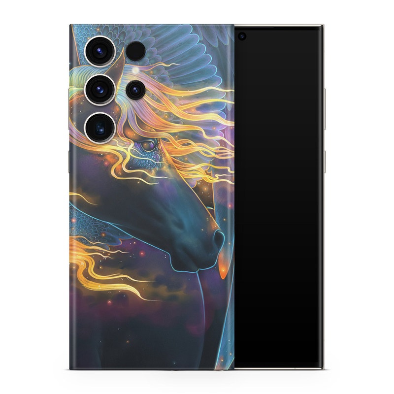 iStyles Samsung Galaxy S23 Series Skin design of Organism, Astronomical object, Art, Electric blue, Space, Darkness, Liquid, Science, Graphics, Visual arts, with black, blue, yellow, white, orange, purple, red colors, and tagged with fantasy, animals, space, flames, horse, stars, constellations, sun.