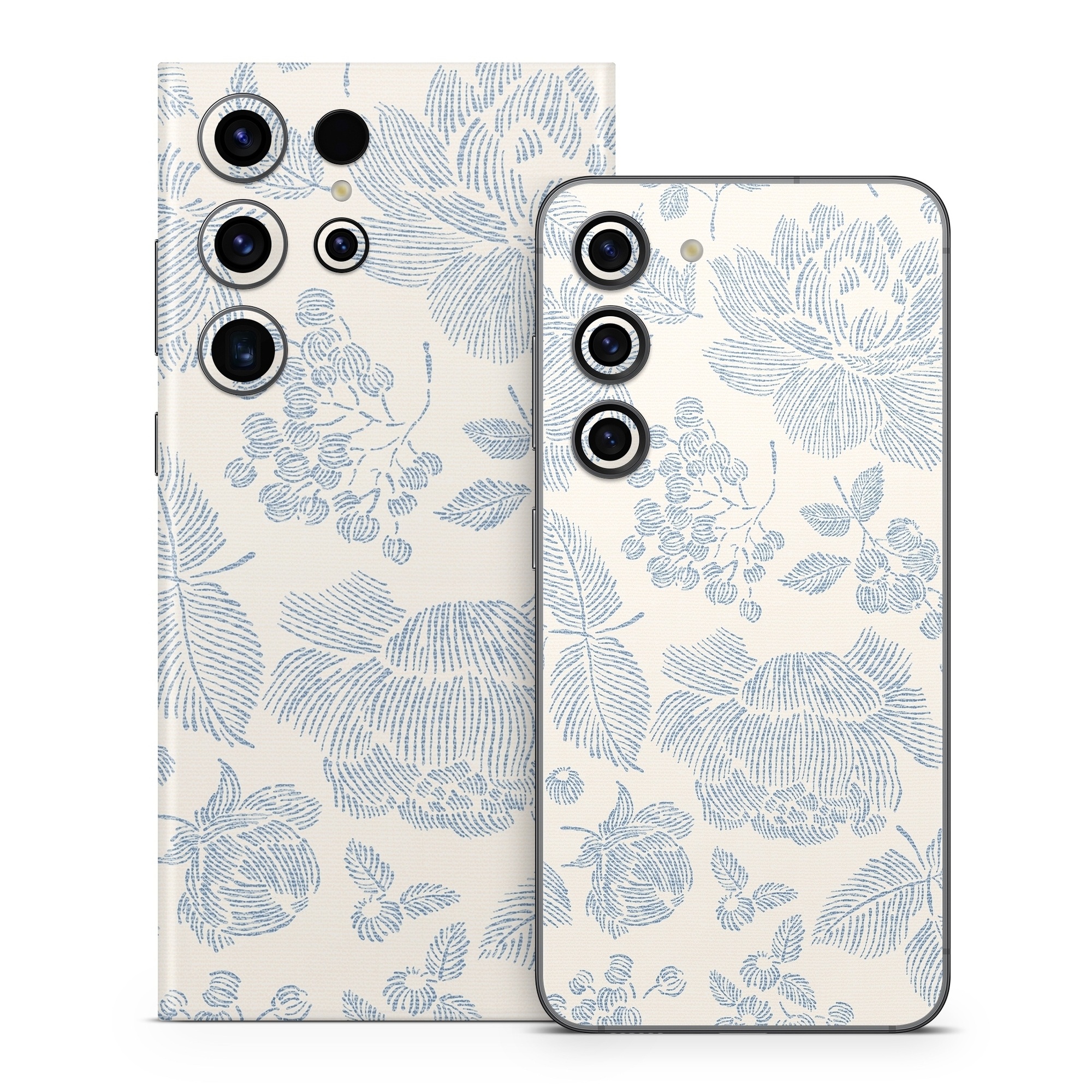 iStyles Samsung Galaxy S23 Series Skin design of White, Botany, Leaf, Textile, Branch, Organism, Art, Aqua, Line, Rectangle, with white, blue colors, and tagged with patterns, flowers, nature, flowers, fabric.