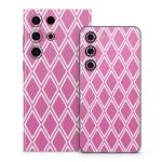 iStyles Samsung Galaxy S23 Series Skin design of Pink, Rectangle, Font, Material property, Magenta, Symmetry, Parallel, Pattern, Peach, Circle, with pink, white colors, and tagged with patterns, checks.