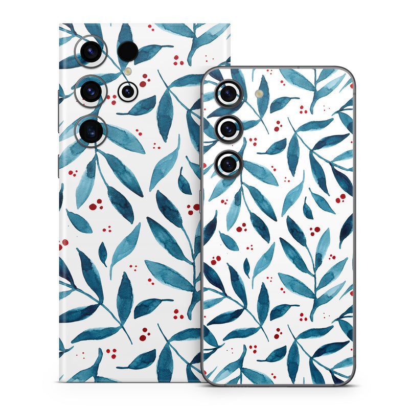 iStyles Samsung Galaxy S23 Series Skin design of White, Azure, Textile, Art, Aqua, Material property, Symmetry, Creative arts, Pattern, Electric blue, with white, blue, red colors, and tagged with patterns, nature, branches, leaves.