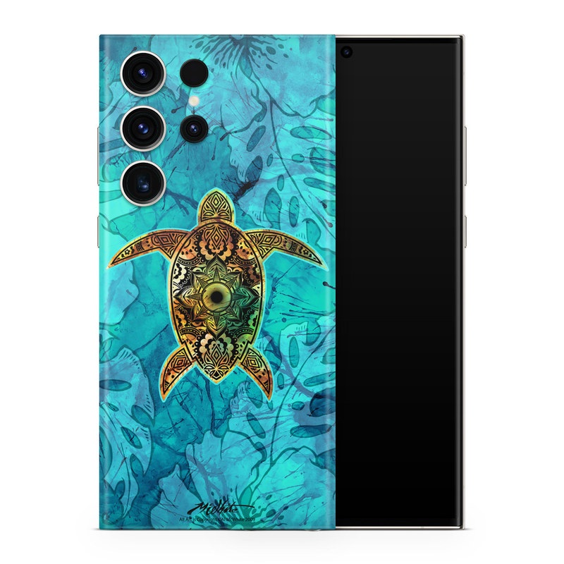iStyles Samsung Galaxy S23 Series Skin design of Sea turtle, Green sea turtle, Turtle, Hawksbill sea turtle, Tortoise, Reptile, Loggerhead sea turtle, Illustration, Art, Pattern, with blue, black, green, gray, red colors, and tagged with animals.