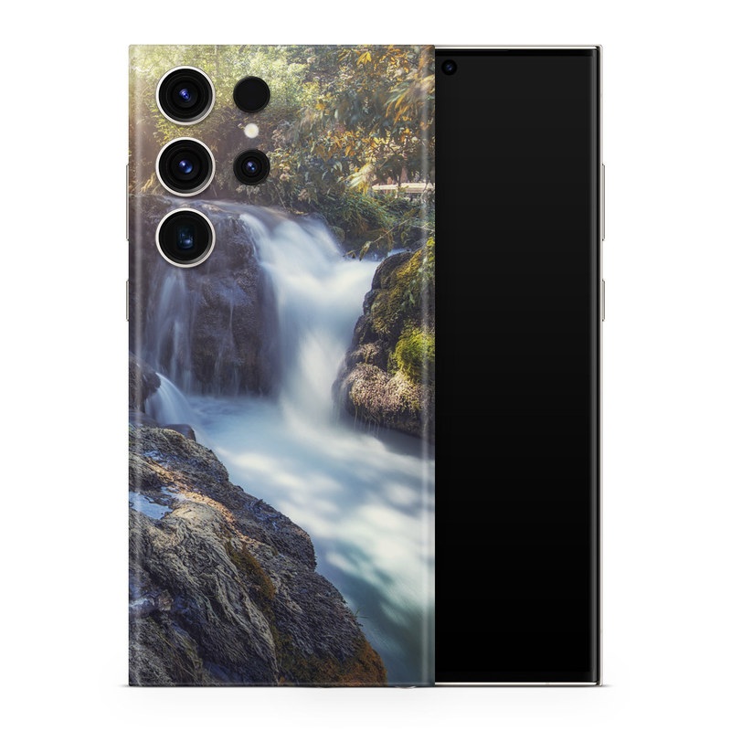 iStyles Samsung Galaxy S23 Series Skin design of Waterfall, Natural landscape, Body of water, Nature, Water resources, Water, Watercourse, Stream, Nature reserve, Rock, with gray, yellow, orange, green, white, blue colors, and tagged with nature, photos, hiking, landscapes, outdoors, photography, waterfall.