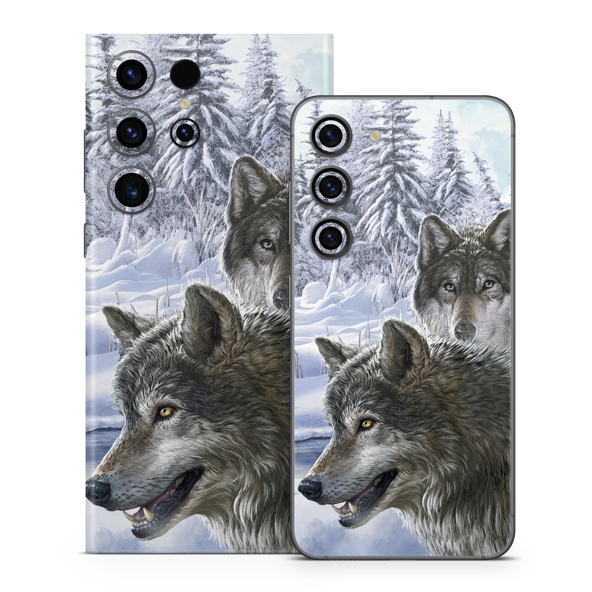 iStyles Samsung Galaxy S23 Series Skin design of Mammal, Vertebrate, Wolf, Canidae, canis lupus tundrarum, Canis, Wildlife, Carnivore, Wolfdog, Dog, with gray, black, blue, purple colors, and tagged with animals, nature.