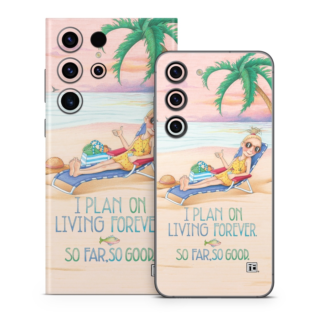 iStyles Samsung Galaxy S23 Series Skin design of Vacation, Product, Summer, Aqua, Illustration, Sun tanning, Fictional character, Caribbean, Graphics, Happy, with pink, green, brown, yellow, blue, white, red colors, and tagged with signs, people, animals, beach, humor, ocean, palmtree.