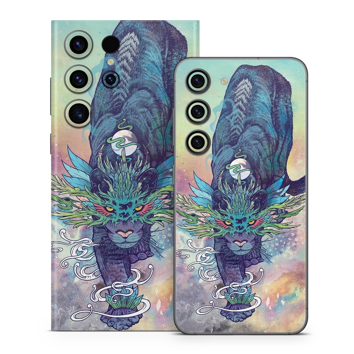 iStyles Samsung Galaxy S23 Series Skin design of Illustration, Fictional character, Graphic design, Demon, Art, Fiction, Cg artwork, Supernatural creature, with blue, green, black, white, yellow, orange, pink, purple colors, and tagged with abstract, animals, animals, cat, illustration, lion, surreal, tiger.