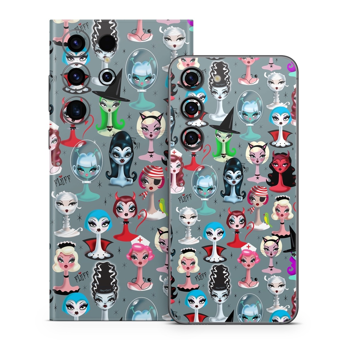 iStyles Samsung Galaxy S23 Series Skin design of Facial expression, Head, Design, Collection, Fictional character, Pattern, Skull, Illustration, Collage, Style, with gray, white, red, blue, green, black, pink, purple colors, and tagged with people, fantasy, objects, costume, halloween, horror, pinup, pinupgirl.