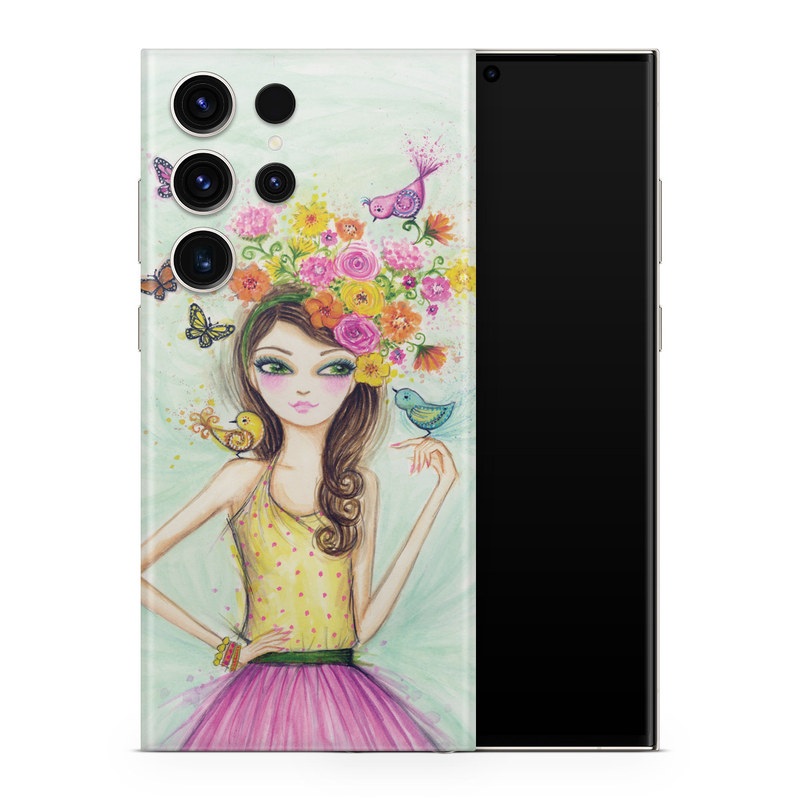 iStyles Samsung Galaxy S23 Series Skin design of Pink, Illustration, Fashion illustration, Watercolor paint, Fictional character, Dress, Hair accessory, Wildflower, Costume, Plant, with blue, pink, yellow, orange, purple, brown, green colors, and tagged with people, fineart, animals, flowers, fashion, birds, dresses, fashion, flowers, spring.