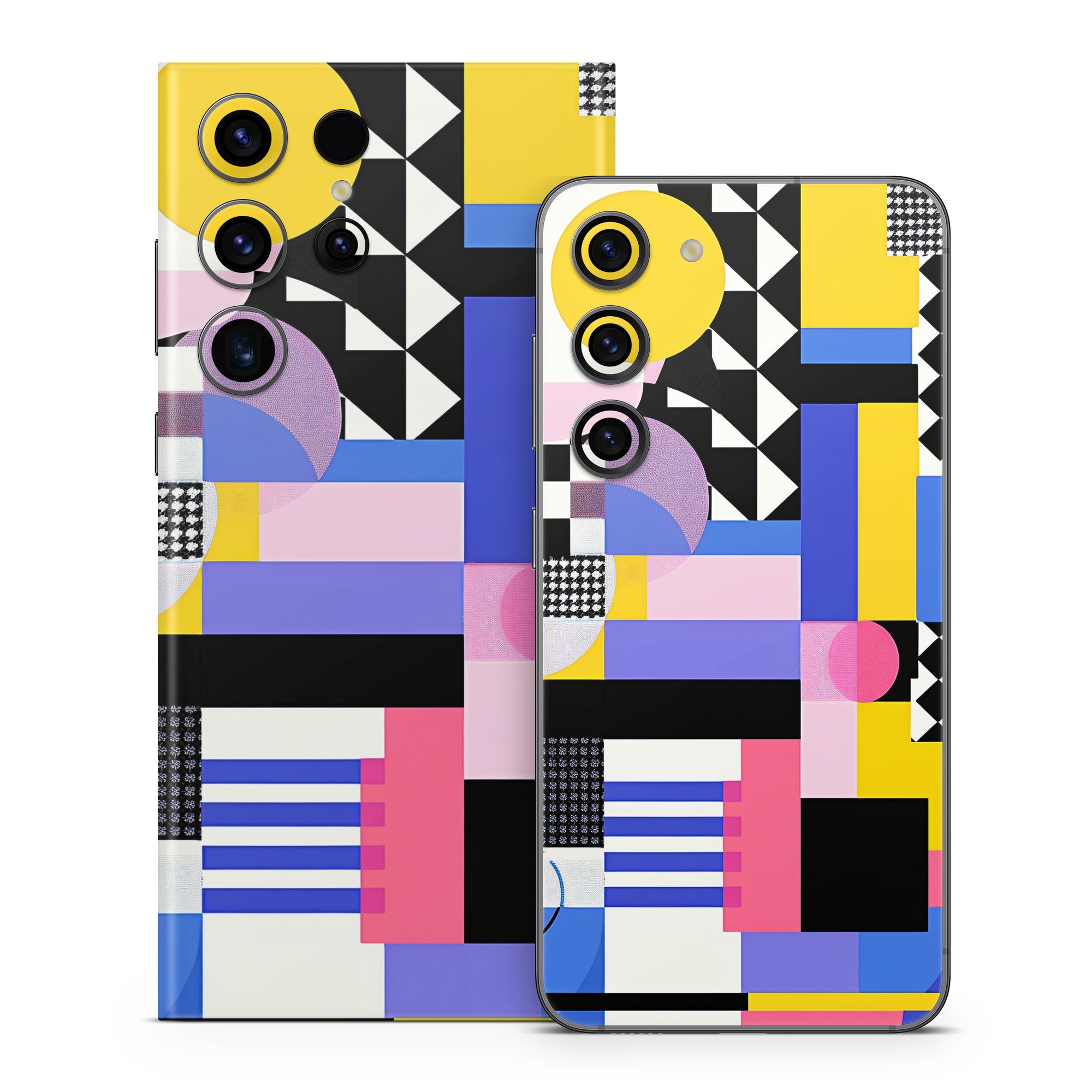 iStyles Samsung Galaxy S23 Series Skin design of White, Black, Rectangle, Font, Art, Red, Pattern, Tints and shades, Circle, Electric blue, with blue, white, black, yellow, pink, purple colors, and tagged with abstract, abstract, circles, squares, checkered, stripes, dots.