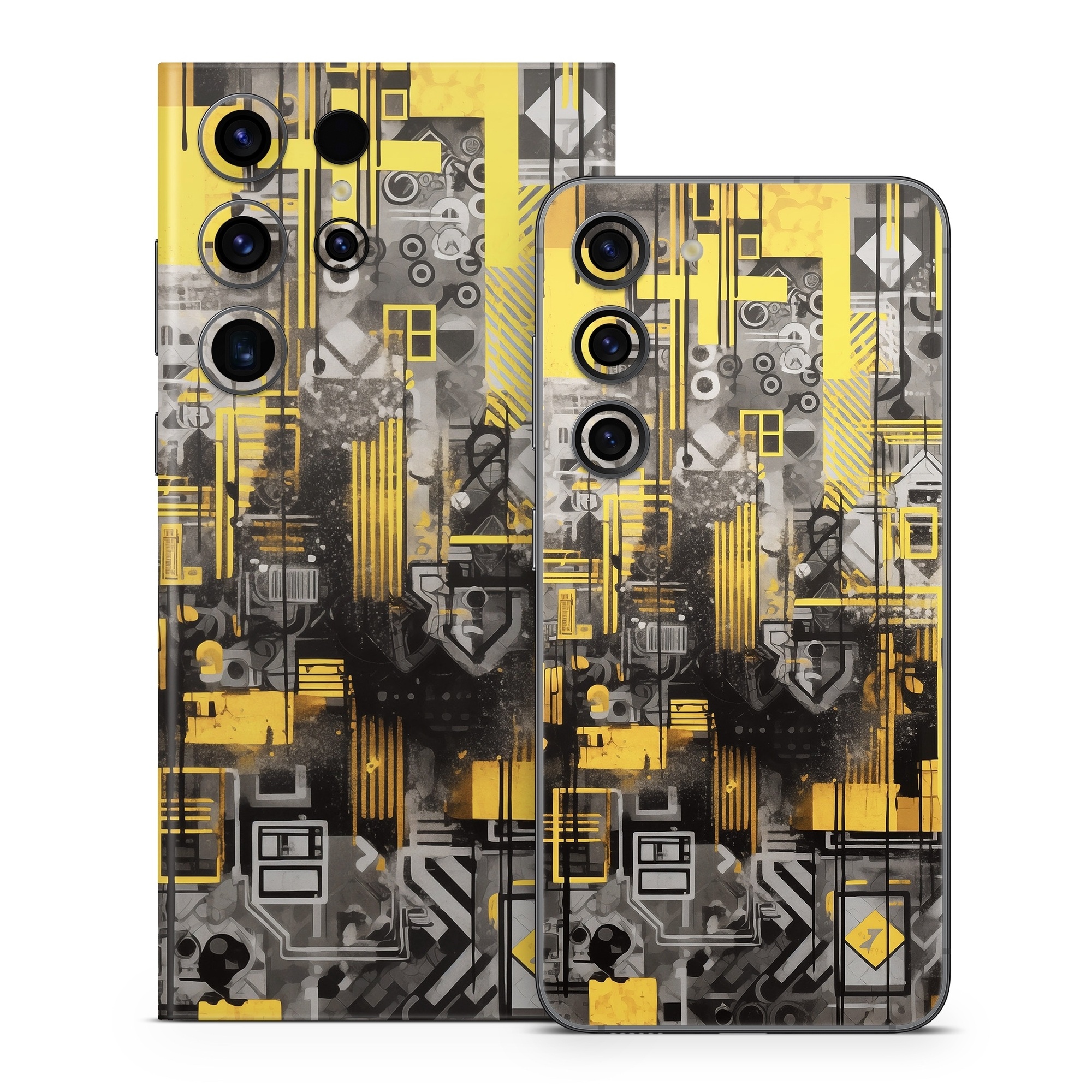 iStyles Samsung Galaxy S23 Series Skin design of Rectangle, Yellow, Font, Art, City, Engineering, Tints and shades, Pattern, Symmetry, Space, with black, white, gray, yellow colors, and tagged with abstract, confusion, work.
