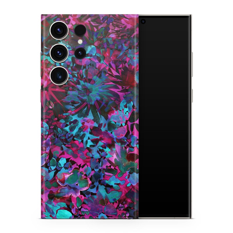 iStyles Samsung Galaxy S23 Series Skin design of Pink, Purple, Violet, Lilac, Flower, Leaf, Plant, Magenta, Botany, Pattern, with black, pink, purple, blue, green colors, and tagged with patterns, flowers, abstract, abstract, bright, colorful, floral, flowers, summer, tropical, watercolor.