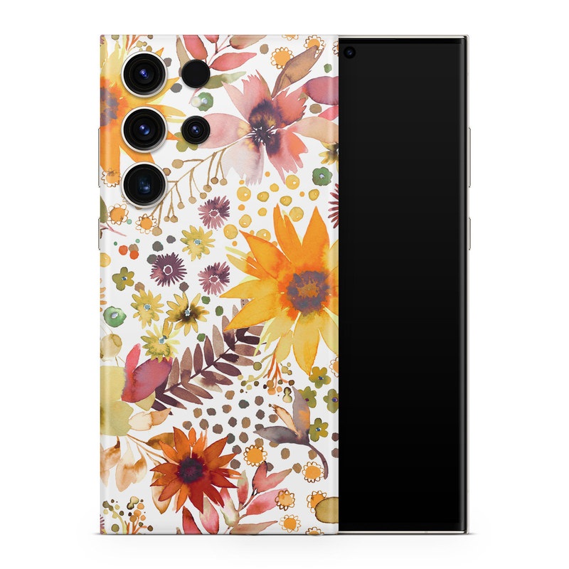 iStyles Samsung Galaxy S23 Series Skin design of Flower, Plant, Petal, Botany, Textile, Orange, Line, Groundcover, Creative arts, Flowering plant, with white, yellow, pink, green, brown, orange colors, and tagged with animals, flowers, patterns, sunflowers, leaves, spring.