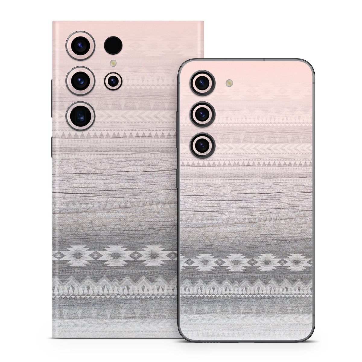 iStyles Samsung Galaxy S23 Series Skin design of White, Beige, Textile, Pattern, Lace, Tablecloth, Linen, Linens, with pink, white, gray colors, and tagged with patterns, nature, natural, nature, pattern, pink, tribal, wood.