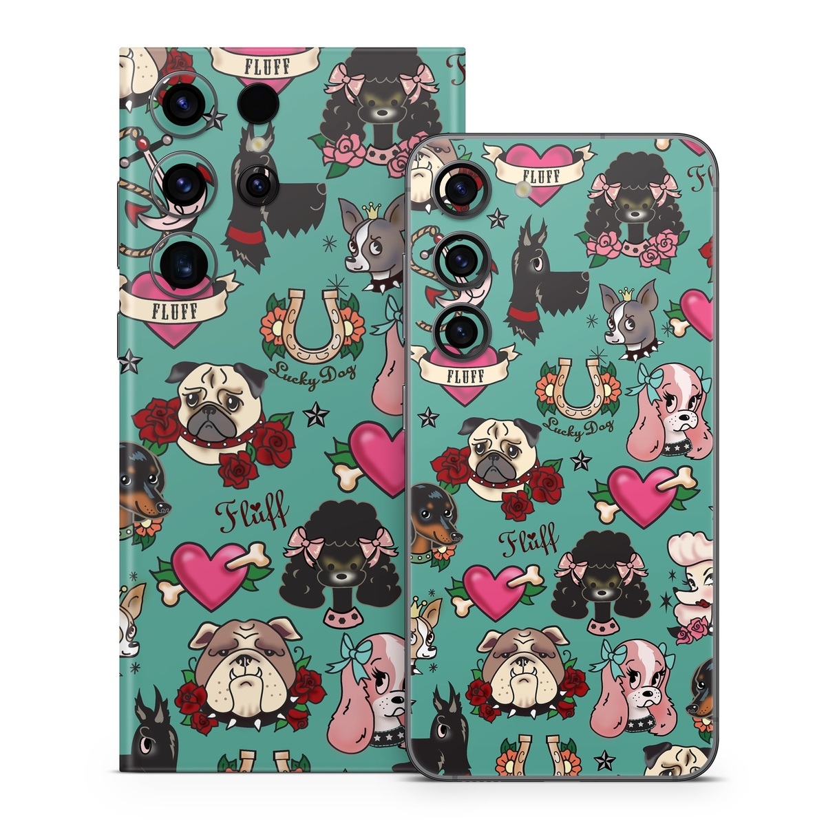iStyles Samsung Galaxy S23 Series Skin design of Cartoon, Pattern, Illustration, Design, Crowd, Textile, Art, with blue, brown, red, white, black, green, gray colors, and tagged with patterns, animals, flowers, objects, hearts, animals, dog, dogs, grunge, pattern, punk, retro, tattoo, tattoostyle.