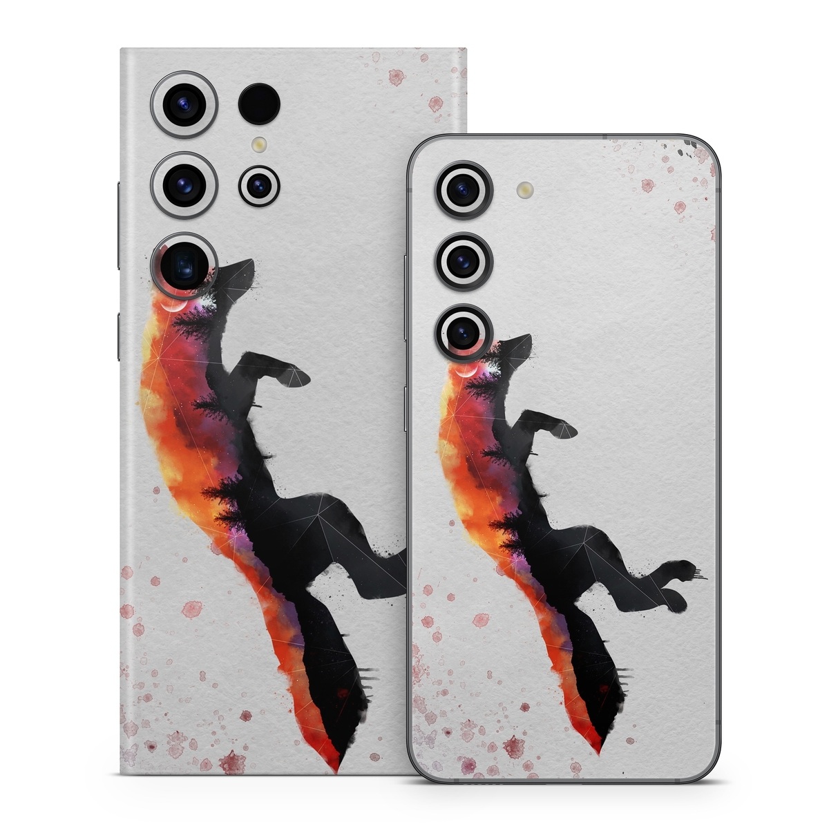 iStyles Samsung Galaxy S23 Series Skin design of Illustration, Watercolor paint, Art, Graphic design, Painting, Red fox, Visual arts, Paint, Drawing, Tail, with gray, black, red, yellow, orange, white colors, and tagged with animals, nature, space, animals, fox, moon, nature, night, stars, watercolor.