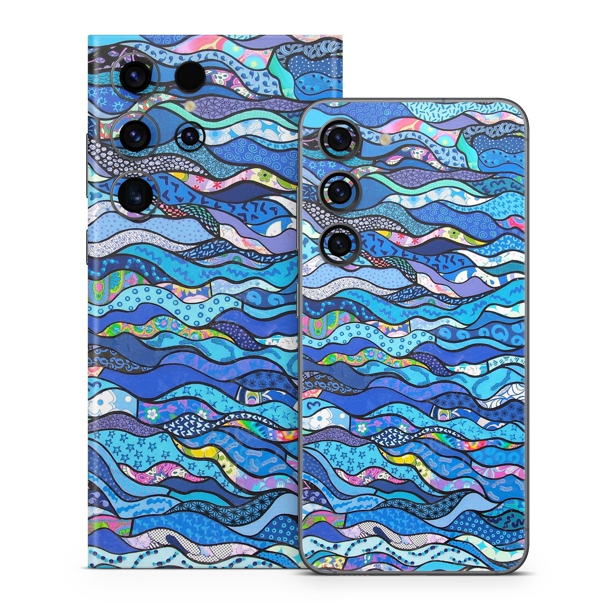 iStyles Samsung Galaxy S23 Series Skin design of Blue, Pattern, Aqua, Water, Line, Design, Textile, Psychedelic art, Electric blue, with blue, black, gray, purple colors, and tagged with abstract, flowers.