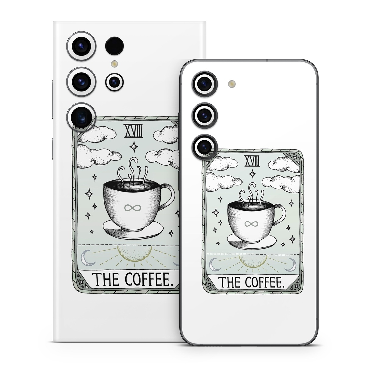 iStyles Samsung Galaxy S23 Series Skin design of Cup, Cartoon, Drinkware, Coffee cup, Tableware, Teacup, Illustration, Drink, Line art, with white, black, green, gray, yellow colors, and tagged with objects, signs, space, coffee, handdrawn, pastel, sketch, tarot.