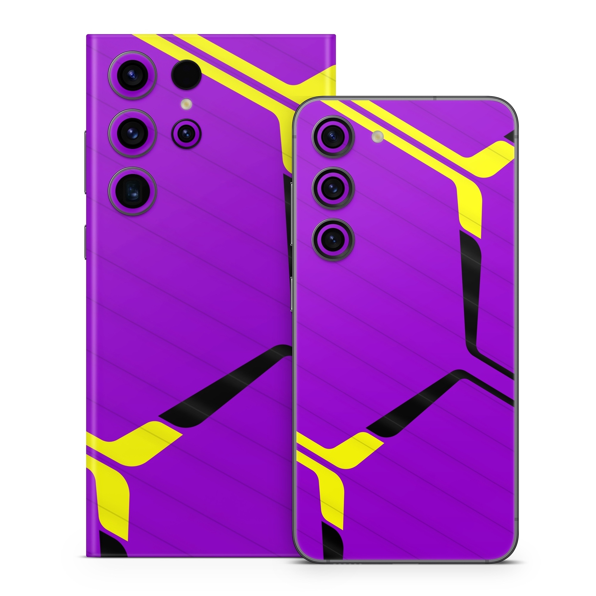 iStyles Samsung Galaxy S23 Series Skin design of Colorfulness, Purple, Violet, Line, Magenta, Parallel, Symmetry, Pattern, Electric blue, Font, with purple, yellow, black colors, and tagged with patterns, hexagon, pattern, lines.