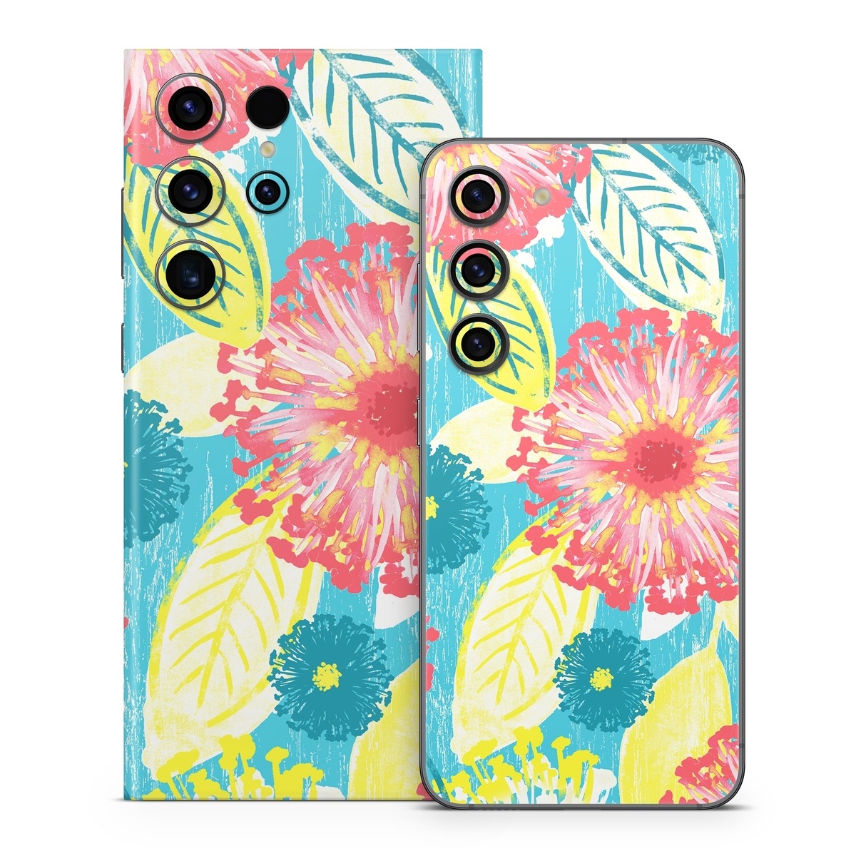 iStyles Samsung Galaxy S23 Series Skin design of Pattern, Design, Flower, Floral design, Plant, Textile, Wrapping paper, Wildflower, Visual arts, with pink, gray, blue, yellow colors, and tagged with flowers, patterns.