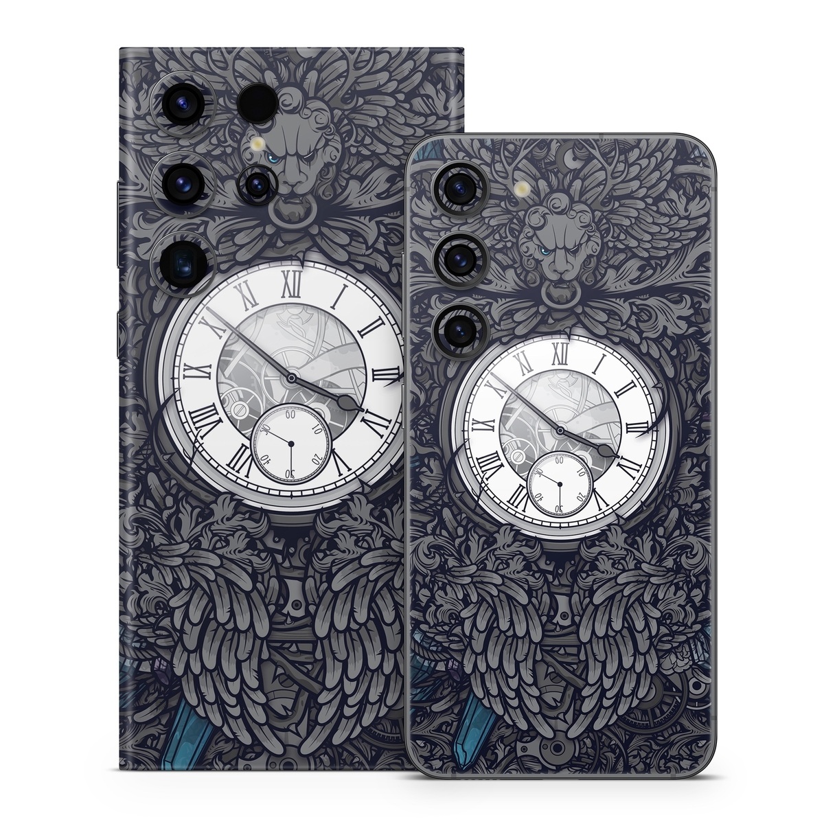 iStyles Samsung Galaxy S23 Series Skin design of Blue, Pattern, Psychedelic art, Design, Circle, Art, Font, Graphic design, Visual arts, Illustration, with black, gray colors, and tagged with objects, patterns, animals, grandfather, clock, clocks, alarm, time, antique, table.