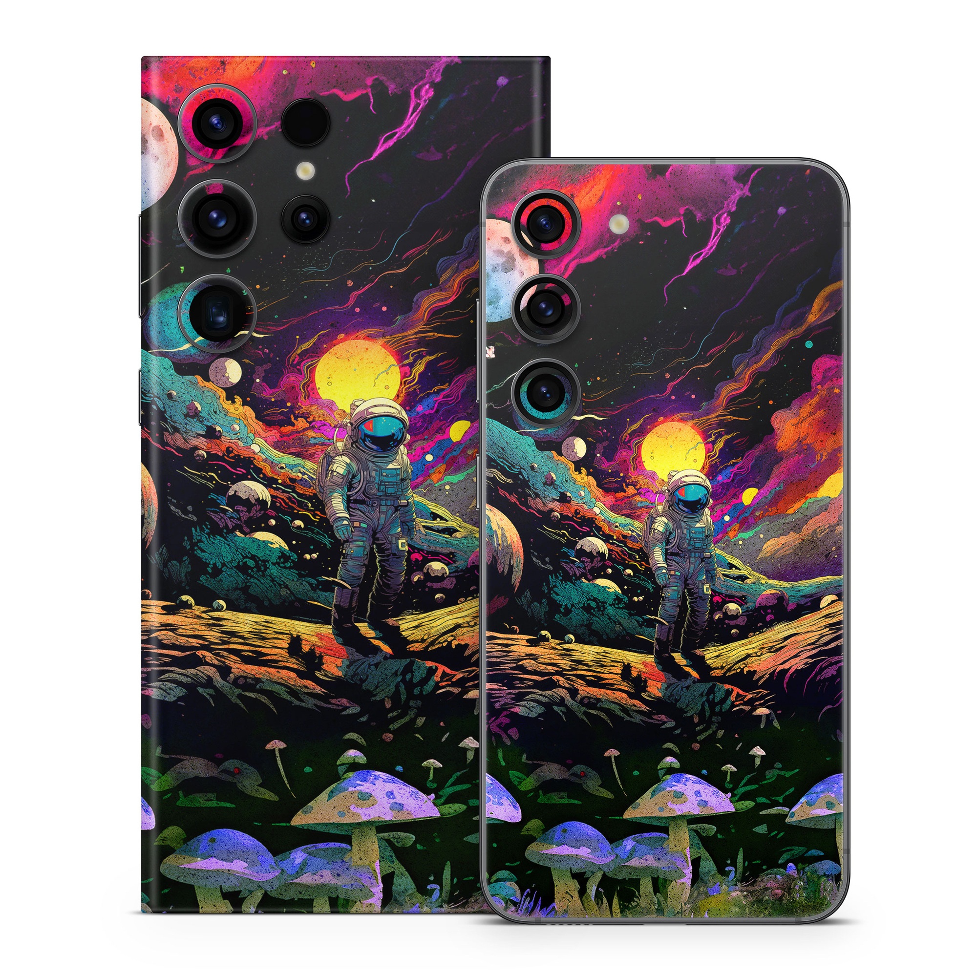 iStyles Samsung Galaxy S23 Series Skin design of Light, Nature, Purple, Umbrella, Plant, Art, Terrestrial plant, Natural landscape, Astronomical object, Space, with black, white, purple, red, gray, orange, yellow, blue, green, brown colors, and tagged with space, people, fantasy, astronaut, plants, sun, moon, galaxy, mushrooms.