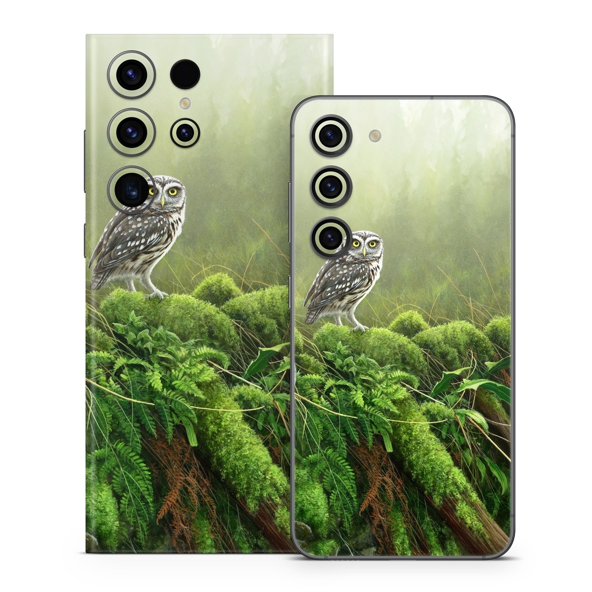 iStyles Samsung Galaxy S23 Series Skin design of Nature, Owl, Bird, Bird of prey, great grey owl, Adaptation, Terrestrial plant, Wildlife, Plant, Organism, with brown, gray, green, white colors, and tagged with animals, nature, fineart, bird, forest, outdoors, owl, owls, tree, woods.