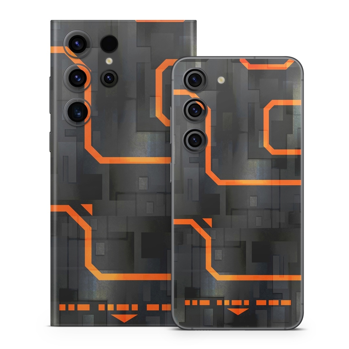 iStyles Samsung Galaxy S23 Series Skin design of Orange, Font, Parallel, Pattern, Graphics, Rectangle, Logo, Brand, Graphic design, Event, with black, orange colors, and tagged with patterns, lookslike, space, spaceship, fighterjet.