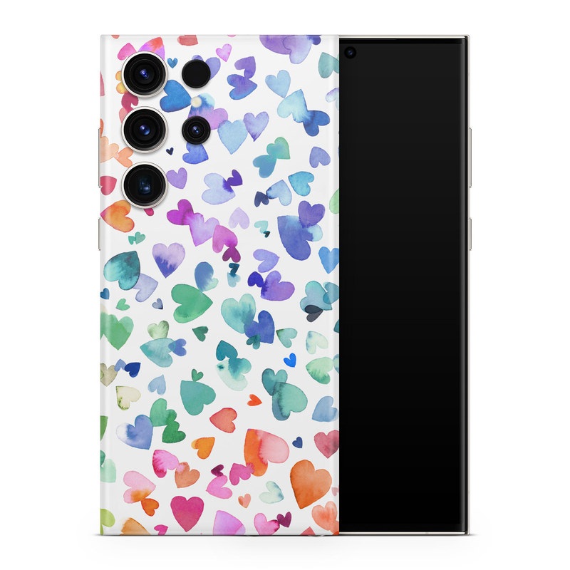 iStyles Samsung Galaxy S23 Series Skin design of Colorfulness, Art, Line, Creative arts, Pattern, Circle, Font, Visual arts, Magenta, Painting, with white, blue, green, red, pink, orange, yellow, purple colors, and tagged with patterns, hearts, heart, hearts, love, pattern, pride, rainbow, shapes, valentine, valentinesday.