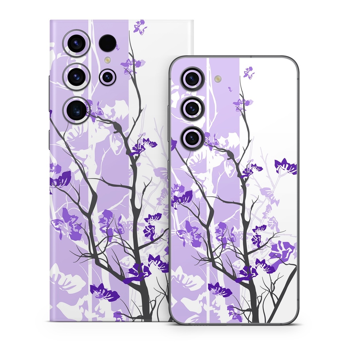 iStyles Samsung Galaxy S23 Series Skin design of Branch, Purple, Violet, Lilac, Lavender, Plant, Twig, Flower, Tree, Wildflower, with white, purple, gray, pink, black colors, and tagged with flowers.