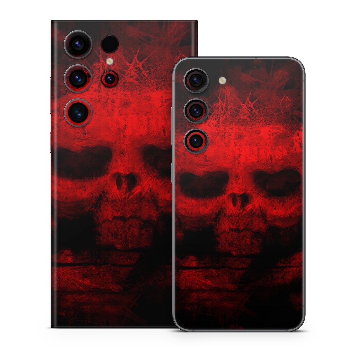 iStyles Samsung Galaxy S23 Series Skin design of Red, Skull, Bone, Darkness, Mouth, Graphics, Pattern, Fiction, Art, Fractal art, with black, red colors, and tagged with skulls.