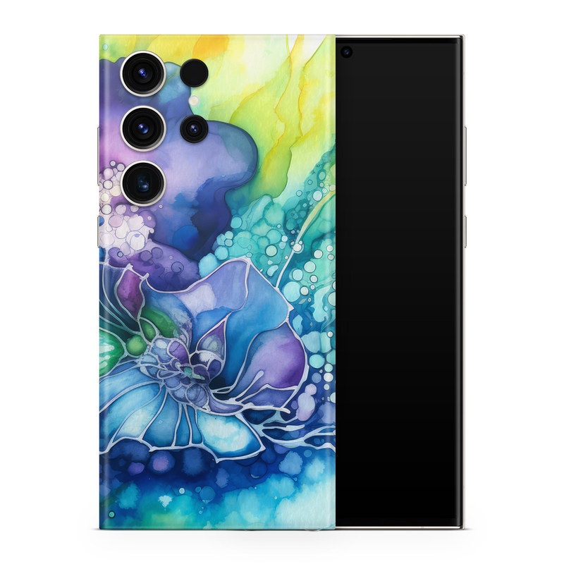 iStyles Samsung Galaxy S23 Series Skin design of Flower, Plant, Art paint, Petal, Blue, Azure, Purple, Art, Paint, Painting, with blue, yellow, green, purple, white, orange colors, and tagged with flowers, fineart, flower.