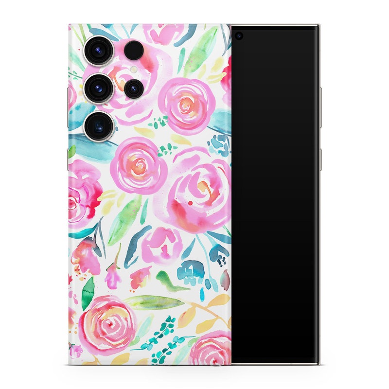 iStyles Samsung Galaxy S23 Series Skin design of Flower, Plant, Petal, Pink, Art, Material property, Magenta, Flowering plant, Pattern, Rose family, with white, pink, green, blue, yellow colors, and tagged with patterns, flowers, flower, flowers, garden, pastel, rainbow, rose, roses, watercolor.