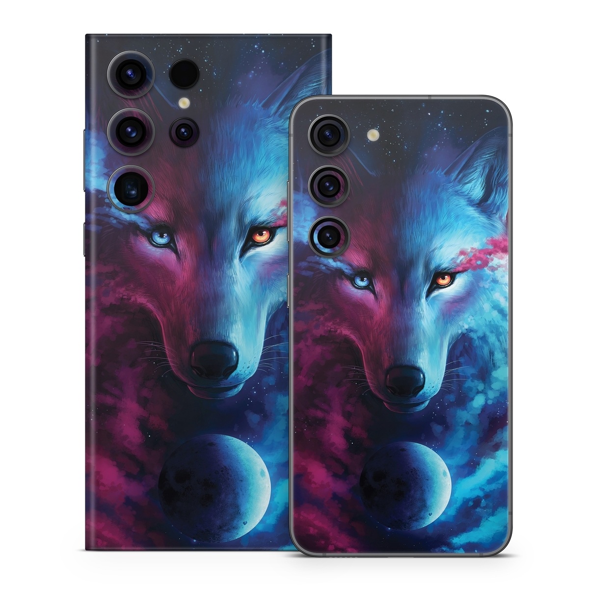 iStyles Samsung Galaxy S23 Series Skin design of Dog, Carnivore, Organism, Iris, Painting, Art, Whiskers, Cg artwork, Electric blue, Space, with black, blue, purple, red colors, and tagged with animals, space, blue, moon, purple, sky, wolf.