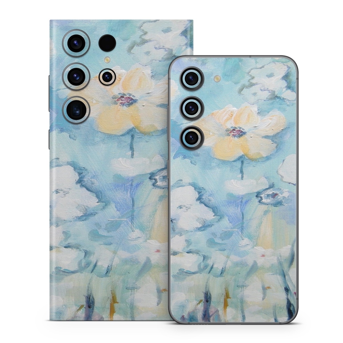 iStyles Samsung Galaxy S23 Series Skin design of Blue, Watercolor paint, Painting, Flower, Plant, Art, Acrylic paint, Wildflower, Visual arts, Floral design, with gray, blue colors, and tagged with patterns, flowers.