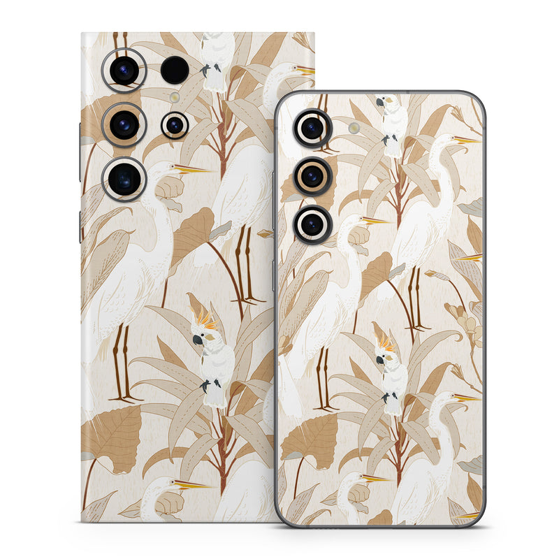 iStyles Samsung Galaxy S23 Series Skin design of Plant, Branch, Organism, Twig, Art, Fawn, Painting, Tail, Pattern, Illustration, with white, brown, gray, yellow, orange colors, and tagged with animals, nature, parrot, cranes, birds.