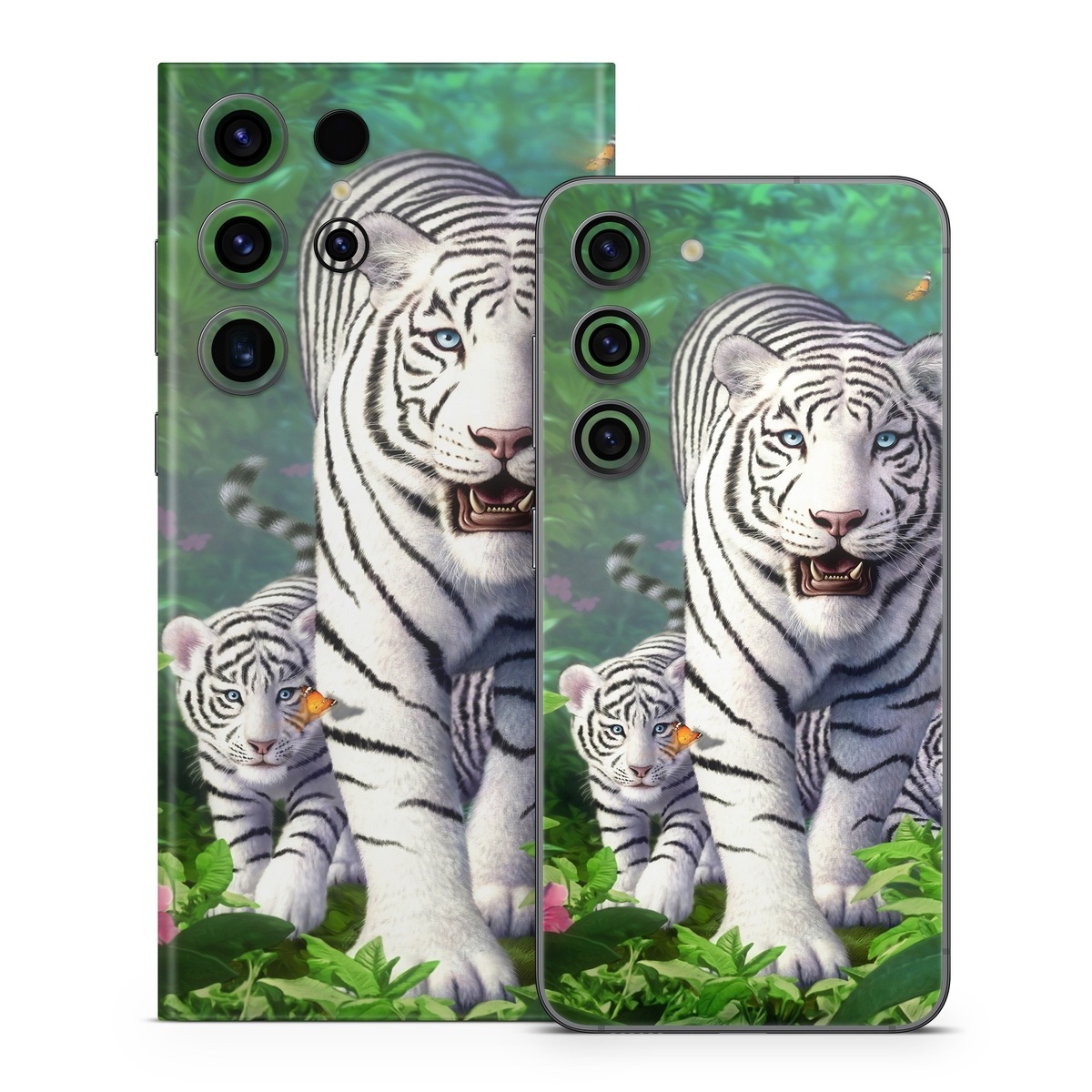 iStyles Samsung Galaxy S23 Series Skin design of Plant, Eye, Plant community, Vertebrate, Felidae, Leaf, Botany, Carnivore, Organism, Terrestrial plant, with white, black, blue, green, pink, yellow colors, and tagged with animals, nature, animal, animals, cub, cubs, green, jungle, outdoor, tiger, tigers, white.