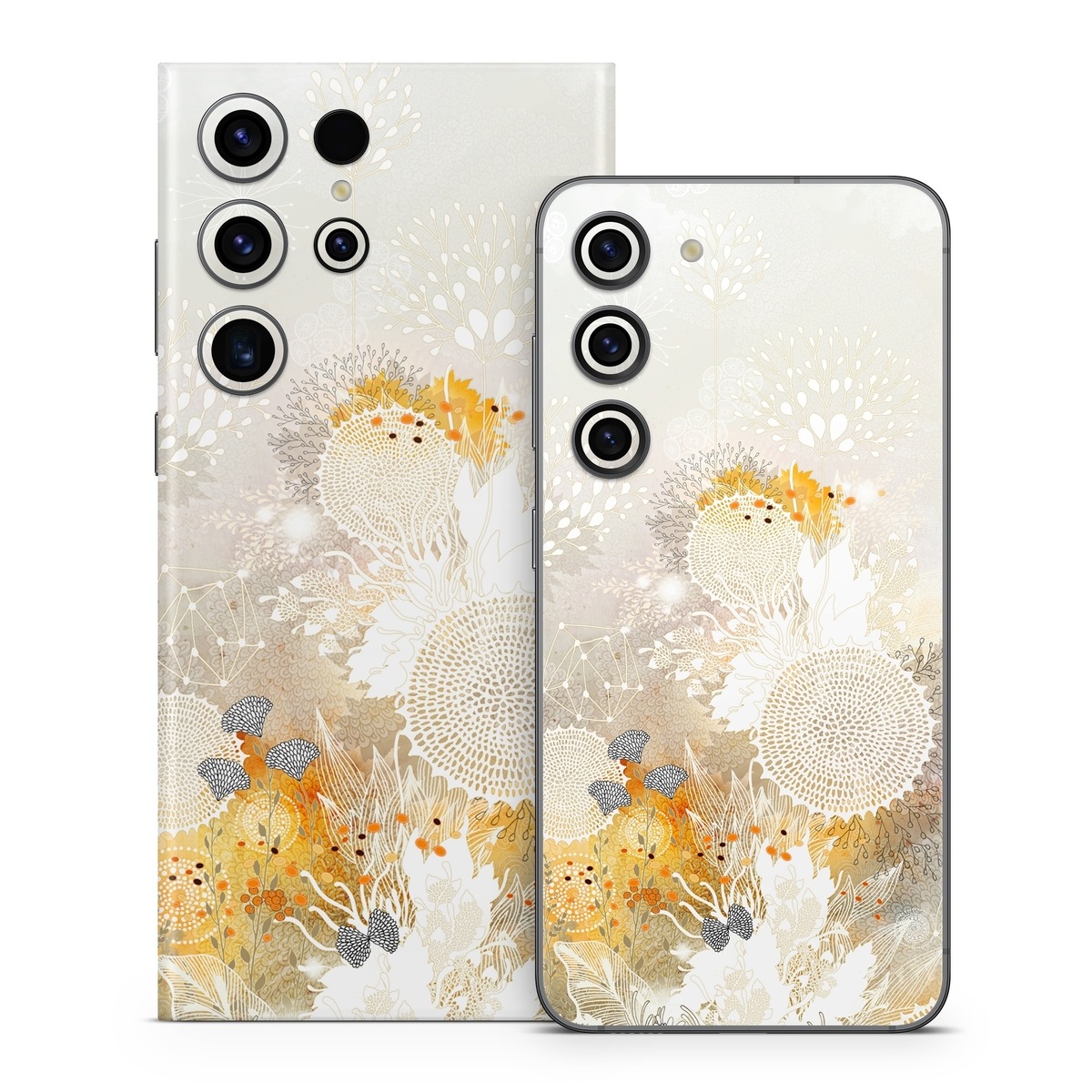 iStyles Samsung Galaxy S23 Series Skin design of Pattern, Floral design, Flower, Plant, Illustration, camomile, Wildflower, Art, with gray, yellow, pink, white, green colors, and tagged with patterns, nature, flowers.