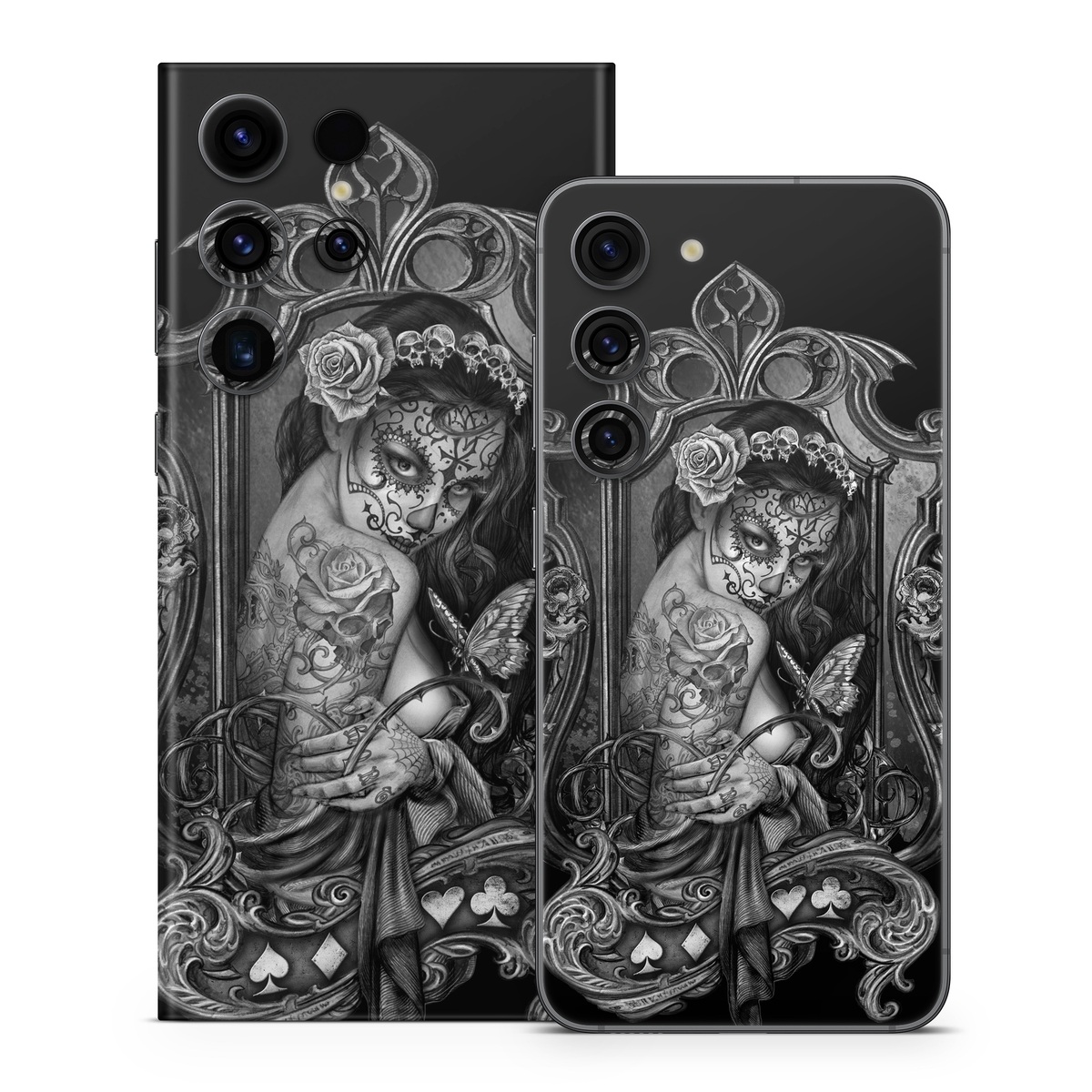 iStyles Samsung Galaxy S23 Series Skin design of Style, Art, Monochrome, Black-and-white, Monochrome Photography, Visual Arts, Illustration, Painting, Drawing, with black, white, gray colors, and tagged with skulls, people, animals, flowers, objects, bride, girl, goth, gothic, lady, skull, sugarskull, tattoo, tattoos, woman.
