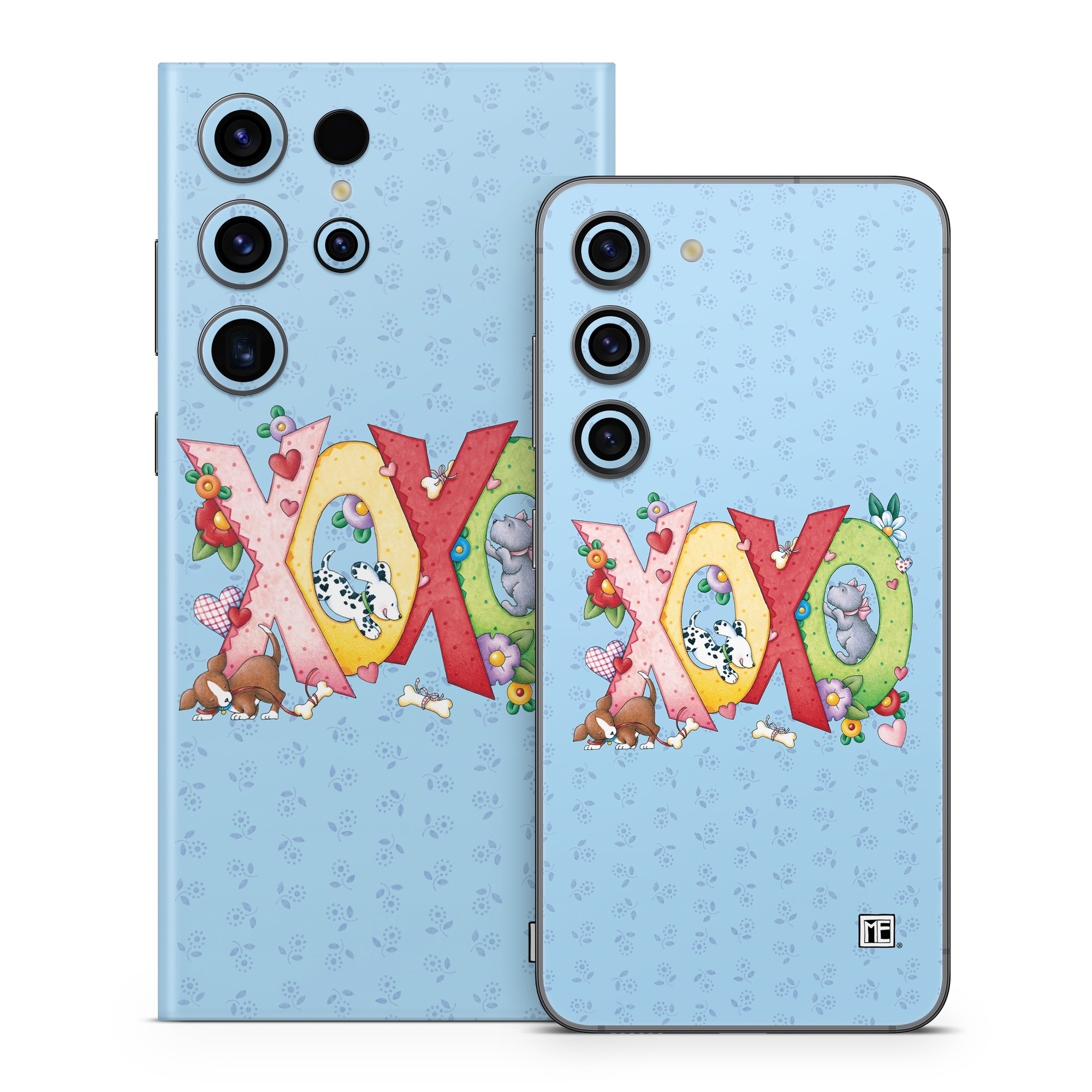 iStyles Samsung Galaxy S23 Series Skin design of Rectangle, Font, Creative arts, Art, Pattern, Happy, Illustration, Circle, Graphics, Visual arts, with blue, pink, yellow, red, green, orange, brown, white, black colors, and tagged with animals, signs, hearts, flowers, patterns, xoxo, love, valentine, puppies, dogs, dalmatians, hearts, flowers.